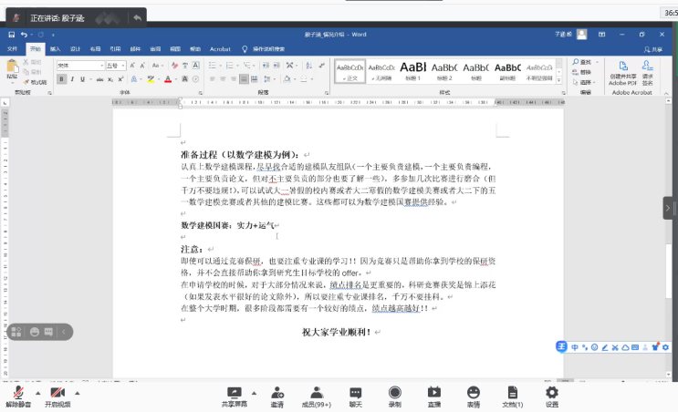 本站讯 为发挥毕业生党员的先锋模范作用,站好毕业前的“最后一班岗”,帮助同学们深入了解考研、保研、出国以及就业形势,引导同学们在今后做出合适的选择,6月11日下午,澳门十大网投平台排行举办了毕业生党员线上经验分享会。澳门十大网投平台排行本科生第二党支部委员魏佳佳主持会议,学院非毕业年级全体学生党员、入党积极分子参加此次会议。