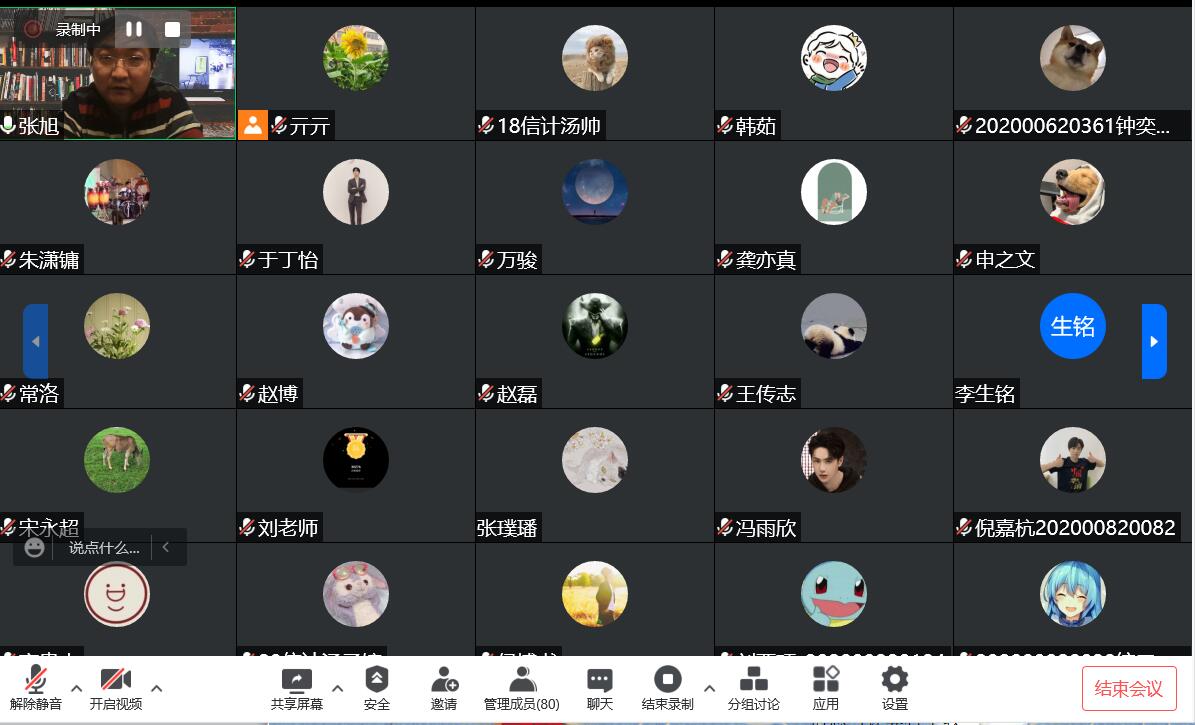 活动中,师生结合疫情防控下个人的工作学习、所见所思等,进行了分享和交流。专业课教师卢红分享了疫情“静止”下的工作和生活,讲述了她的丈夫坚守线上教学的同时,还作为志愿者投身社区防疫一线的故事。毕业后即将走向辅导员岗位的2018级学生李明威,在讲述中介绍了疫情防控下学工队伍和学生志愿者的辛苦付出,希望同学们能够给予理解、学会感恩,做好力所能及之事,齐心协力、共克时艰。2018级信息与计算科学专业保研学生夏逸斐,与大家分享了大学四年的成长,他以个人“2020年疫情期间严格自律,实现绩点逆袭并顺利保研”的经历,鼓励大家疫情期间不要放松要求,调整心态,合理规划时间,做到和线下课堂同质等效。