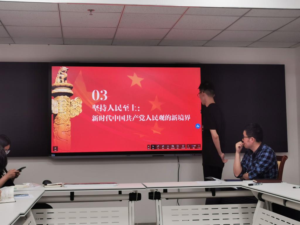 活动中,王海洋首先介绍了坚持真理、坚守理想,践行初心、担当使命,不怕牺牲、英勇斗争,对党忠诚、不负人民的伟大建党精神,并阐释了党的二十大报告中概括的“六个必须坚持”中“必须坚持守正创新”的重要意义、重大原则以及实践路径。蒋沂晓主要介绍了坚持人民至上的重要性以及确立习近平同志党中央的核心、全党的核心地位,确立习近平新时代中国特色社会主义思想的指导地位的决定性意义。主题分享结束后,学生党员充分讨论学习感悟,大家表示,中国共产党人的初心和使命,就是为中国人民谋幸福,为中华民族谋复兴,这个初心和使命是激励中国共产党人不断前进的根本动力,青年要以永不懈怠的精神状态和一往无前的奋斗姿态,继续朝着实现中华民族伟大复兴的宏伟目标奋勇前进。