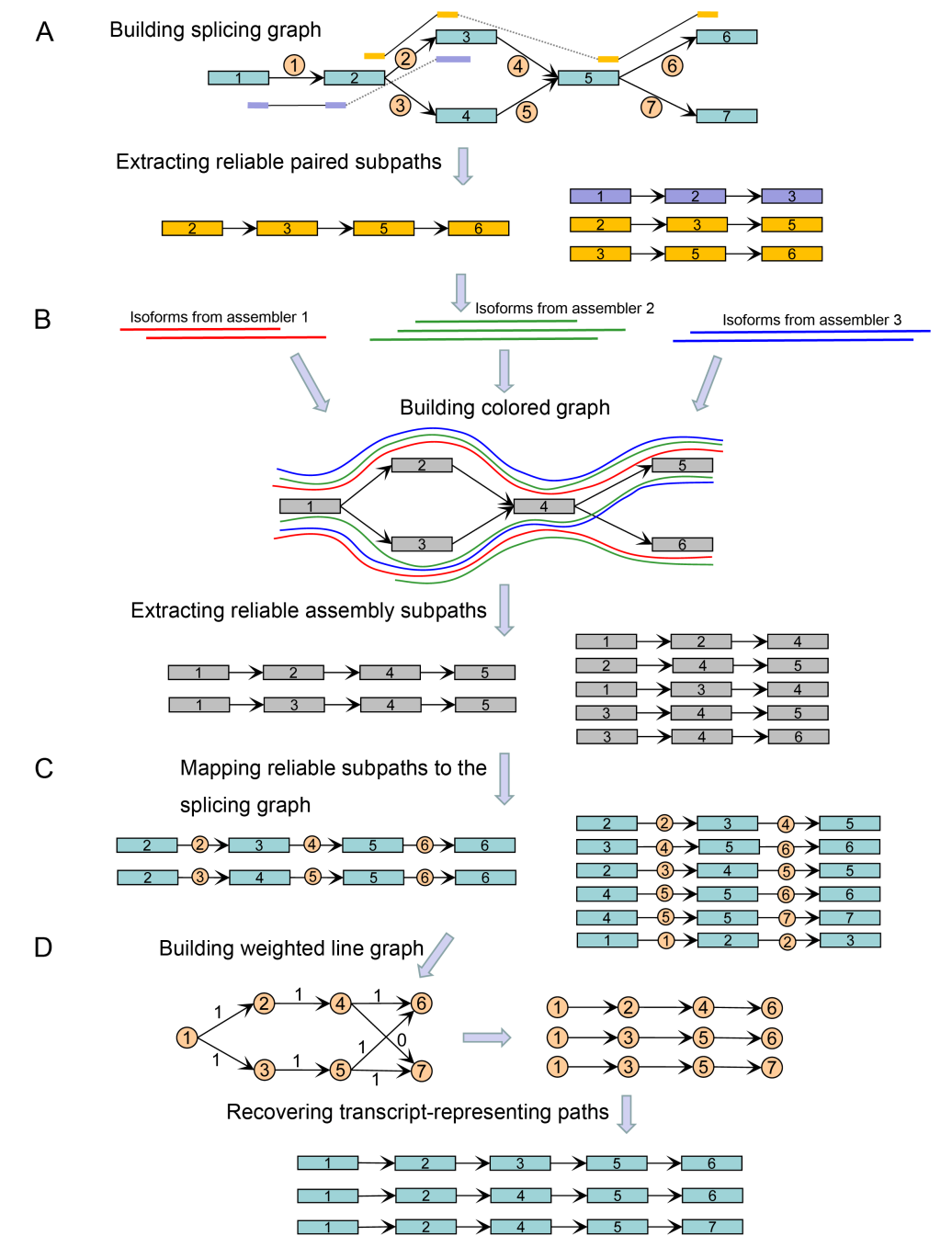 如下图所示,该方法,TransBorrow,首先根据RNA-seq测序片段的回贴构建剪接图(splicing graph),并根据双端测序信息,提取出可靠的双端子路(reliable paired subpaths)。之后,为了借用多种拼接算法的拼接结果来达到一致性最优,TransBorrow创造性的根据不同的拼接结果来构建一个全新定义的着色图(colored graph),并从该图中提取可靠的拼接子路(reliable assembly subpaths)。接着,TransBorrow会把这些可靠的拼接子路回贴到原始的剪接图中,找到它们对应于剪接图中的子路。这些子路联合可靠的双端子路将对后续的拼接过程起到准确高效的指导作用。最后,将上述过程中的两类可靠子路作为种子,利用全新的路径搜索算法产生出代表表达转录本的路覆盖,路覆盖中的每一条路代表一个预测出的表达转录本。由于充分结合了不同拼接方法的拼接结果,TransBorrow的拼接将达到一致性最优。