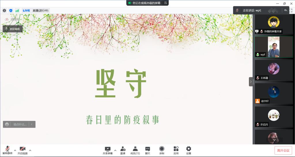 本站讯 疫情防控是一场没有硝烟的战争,更是一堂鲜活生动的思政大课。面对新冠肺炎疫情这场大考,澳门十大网投平台排行顺势而为,借势而进,将身边“抗疫”点滴化为思政“新教材”。3月28日晚八点,学院师生通过腾讯会议及直播链接相聚“云端”,开展了一期生动的思政课《坚守——春日里的防疫叙事》。学生志愿者代表、辅导员、专业教师、校友兼教师家属代表及学生家长共11位讲述者,生动再现了疫情防控期间发生在身边的动人故事,分享了这场大考下的经历、坚守与成长。本次思政课堂由学院党委副书记王鹏飞主持,学院全体党政领导、全院师生、部分家长共计600余人在线参与。