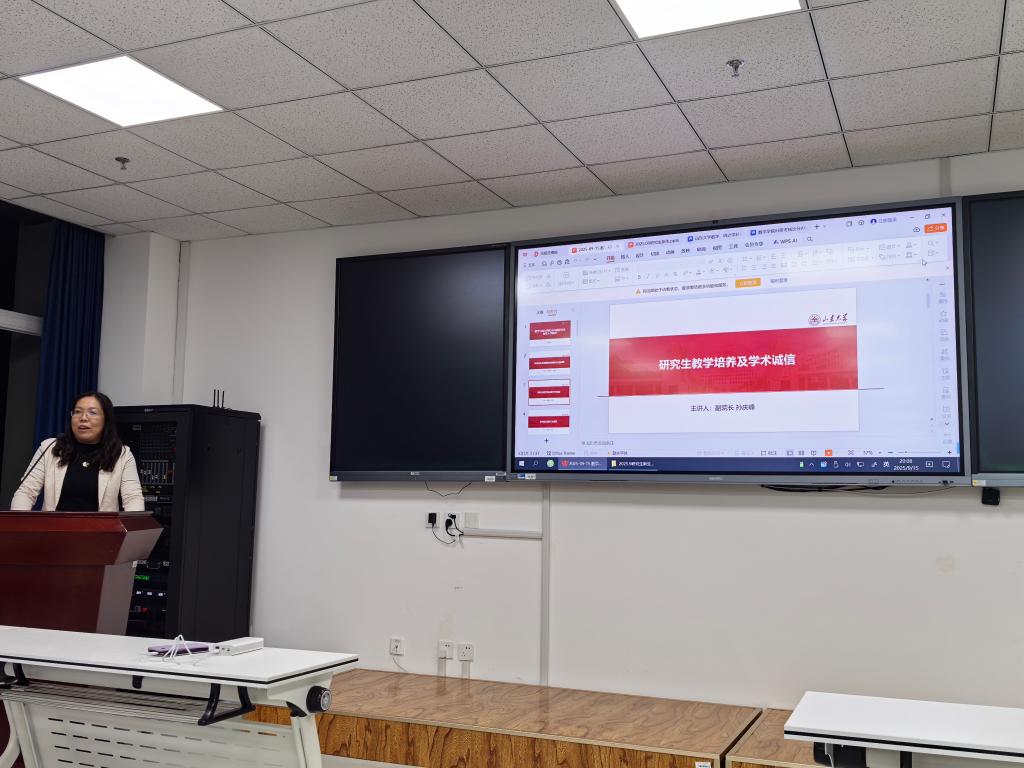 孙庆峰重点分享了研究生教学培养体系和学术规范要求。她强调了研究生毕业的相关要求条件,详细讲解了学生科研如何选题、攻克、写作、发表等流程。讲到学术规范,孙庆峰列举了学术预警期刊,劝诫研究生遵守学术规范,严守学术诚信,加强学术原创性,杜绝抄袭、伪造、一稿多投等恶劣行为。