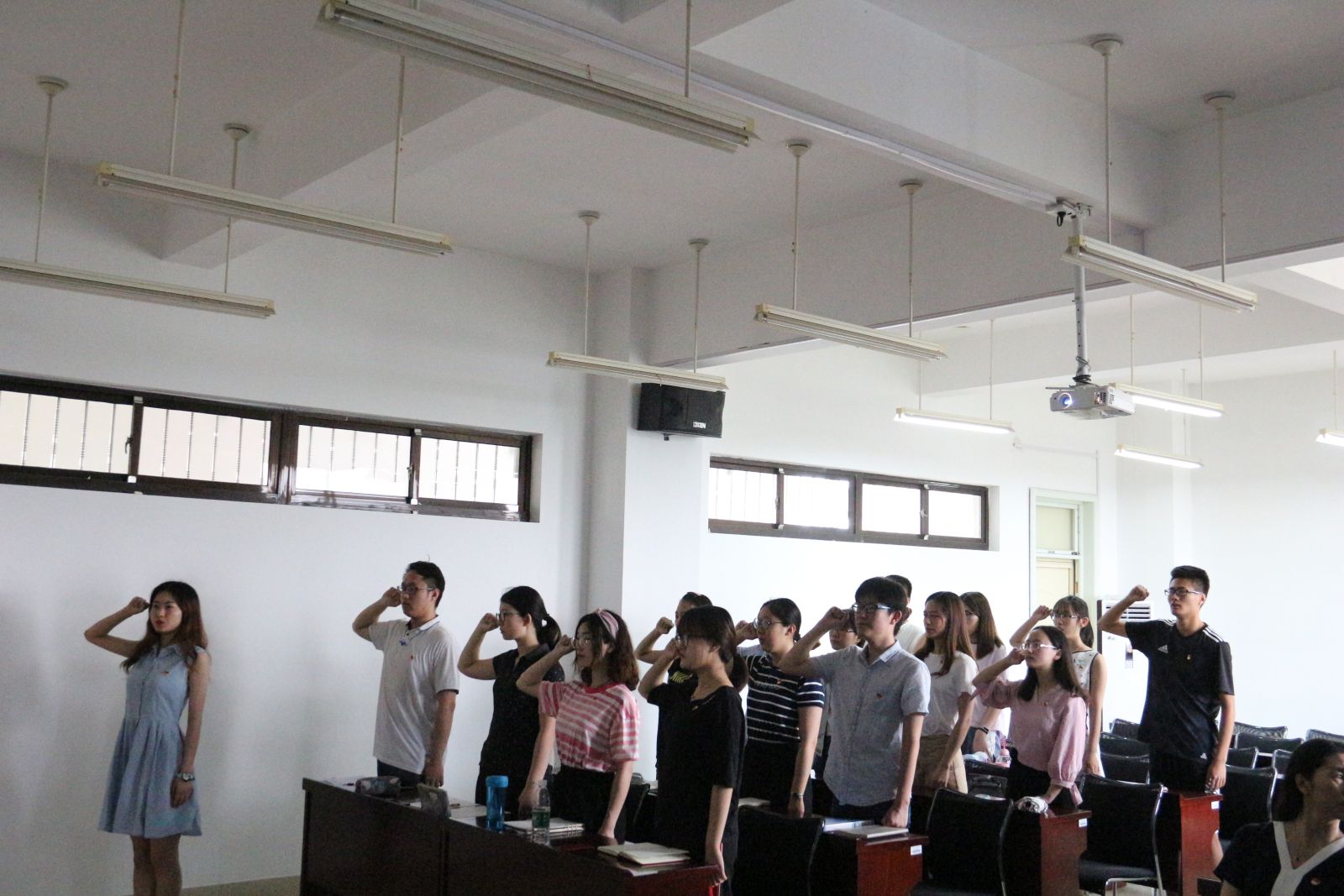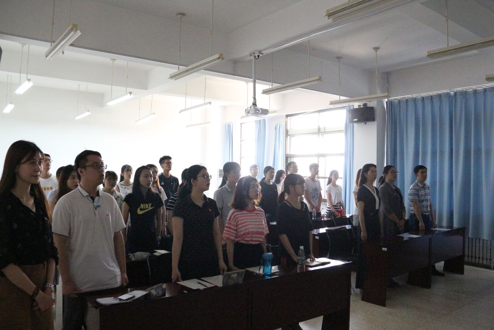 在高亢的国际歌声中,入党宣誓仪式正式开始。王鹏飞宣读了参加宣誓的预备党员名单。15名新发展的党员在领誓人王雨萌的带领下,面对党旗,高举右手,庄严宣誓。2015级统计专业庞道琳代表新党员发言,他感谢了党组织的关心、培养和教育,并表示加入党组织后,将会继续加强理论知识学习、认真履行党员义务、全心全意为同学们服务,努力为学院和学校的发展、为国家和民族的富强贡献自己的光和热。2015级信息与计算科学专业王昕然代表老党员发言,她对新发展的党员表示祝贺,同时结合自身经历,讲述了自己加入党组织以来的成长与收获,鼓励新老党员相互监督、相互学习、共同进步,用实际行动践行入党誓词。