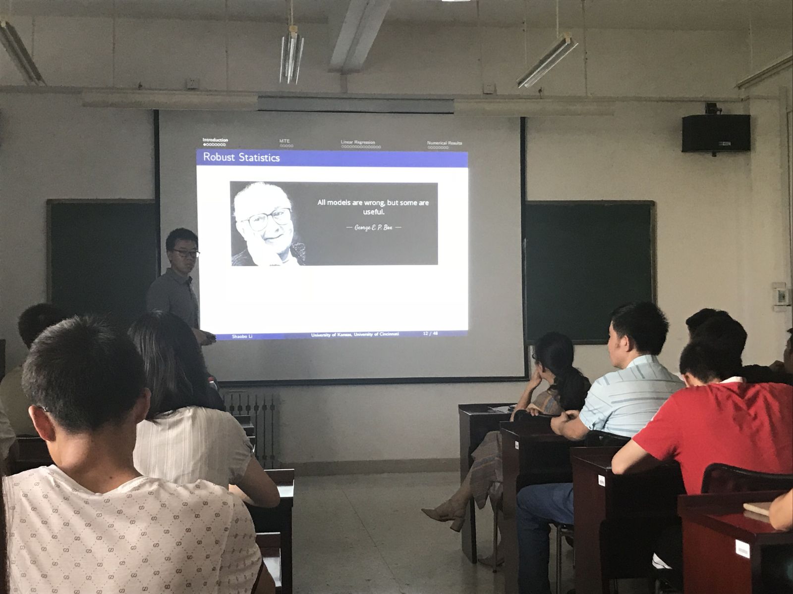 李少博博士结合个人经历介绍了数学类专业学生未来可以从事的研究及就业方向,引起了师生们的强烈兴趣。报告中,李少博运用以MTE方法解决噪声点对整体估计影响的例子,证明了与MLE相比,该估计方法具有很强的鲁棒性。报告结束后,李少博详细回答了老师及同学们的问题,并且提供给同学们非常实用的在研究中数据来源的途径。李少博博士的报告逻辑严密,富有前沿性又兼具科普性,师生们受益良多。