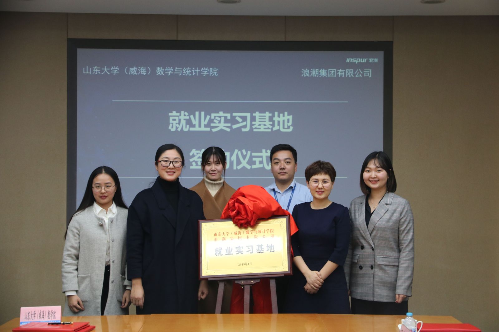在浪潮集团,学院一行先后参观了浪潮云计算创新中心和人力资源共享服务中心(HRSSC),零距离了解了浪潮的发展历程、国内领先的云平台基础设施以及云计算、大数据、人工智能等新兴技术构建的智慧方案,切身体验HRSSC一站式共享服务运行模式。在随后的座谈中,双方就院企合作融合的角度展开了深入的交流,围绕人才培养、协同育人、学生实习实践、校园招聘等方面进行了探讨,初步达成了合作意向。浪潮集团人力资源部副总经理苏玉玲与王鹏飞代表双方签订了就业实习基地合作协议,与会人员共同为实践基地揭牌,拉开双方合作的序幕。