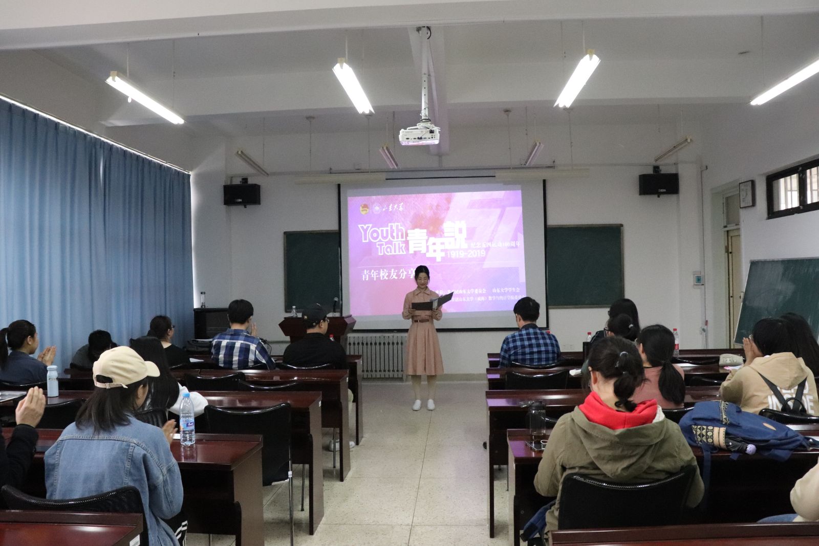 活动伊始,主持人介绍中国青年“以青春之我,创建青春之国家,青春之民族”的历史奋斗历程,引出本次活动的两位优秀青年校友上台进行经验分享。胡琴琴以自身学习经历向大家阐述,即使暂时没有长远目标与人生规划,也应努力走好当下每一步,方能抓住机遇成就无悔青春;陈潇告诫大家,凡事不能以功利为出发点,利用好图书馆的宝贵资源,勤读书,开阔眼界后方能明察人生,并指出“五四运动”源于读书人的良知,青年应保持读书人的操守。王鹏飞书记总结两位嘉宾老师的分享,强调当代青年在继承 “五四运动”精神的同时要发扬其时代意义,既要志存高远,又要脚踏实地,拼搏奋斗,抓住机遇,以实际行动践行“五四运动”精神。最后,在“Youth Talk”我们说环节中,主持人代表学院青年,诉说誓要牢记习近平总书记在纪念五四运动100周年大会上讲话的重要精神,担当时代责任,勇立时代潮头,争做时代先锋的想法,说出了青年代表的心声。