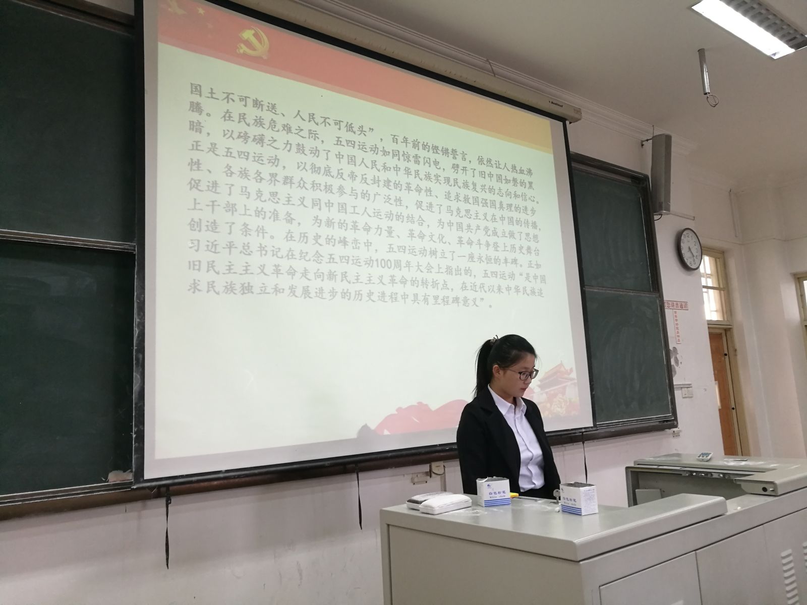 首先,尚思语简要介绍了五四运动的发源与经过,并带领大家一起学习了习近平总书记关于纪念五四运动100周年的重要讲话精神。习近平总书记在讲话中强调,五四运动“以磅礴之力鼓动了中国人民和中华民族实现民族复兴的志向和信心”。尚思语指出,每个青年都应该珍惜这个伟大时代,把自己的理想同祖国的前途、把自己的人生同民族的命运紧密联系在一起,扎根人民,奉献国家,做新时代的奋斗者、五四精神的传承者。这番话引发了很多同学的思考。最后,同学们一起朗诵了诗歌《百年五四》,活动在整齐洪亮的朗诵声中落下帷幕。