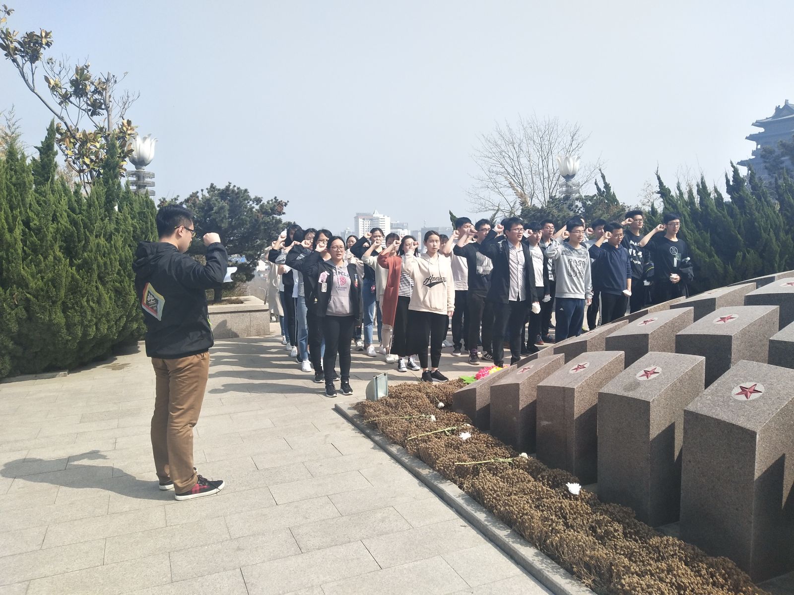 本站讯 2018年4月2日下午,2016级数学与应用数学班在威海市烈士陵园举办了“奠卫国烈士英魂,弘爱国民族精神”清明节扫墓活动,班级全体学生参加本次扫墓活动,活动由就业委员张敏主持。