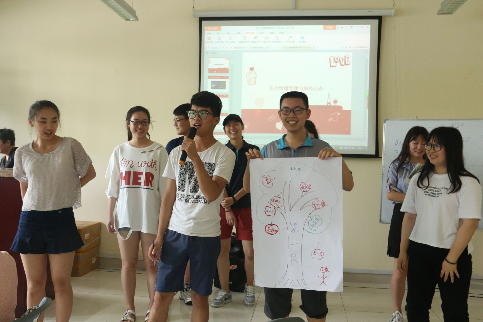 课堂伊始,助教通过分组的方式将参与同学分为7组,在热烈的小组讨论后,每一组展示了各自富有创意的队名、队训、队歌及其队形。紧接着,姜颖老师利用图片展示的方法让同学们认知到情绪产生的来源,并通过生动形象的例子引入了情绪管理方法以及减轻负面情绪的有效办法。为了使课堂更加活泼有趣,姜颖老师与同学们进行了一系列互动,如展示情景短剧、分组总结概括等等。每组同学集思广益、主动展示,台下同学积极响应,掌声不断,课堂气氛融洽。在课堂上,同学们通过人格特质判断测试大致了解了自己的性格,姜颖老师针对每个人的性格提出了减压与管理情绪的办法。课间休息时,助教带领同学们做了很多小游戏,在欢声笑语中大家度过了短暂美好的时光。