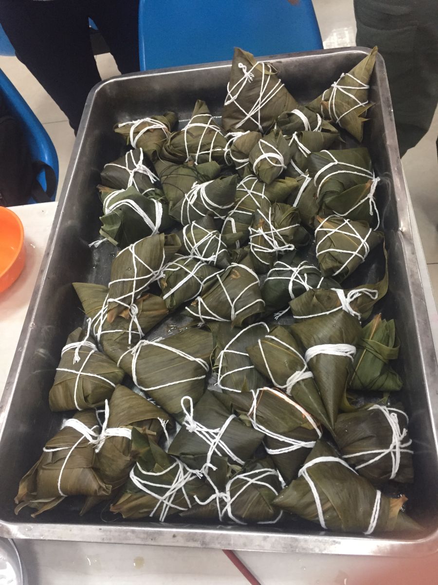 活动伊始,全班同学准时在泰园二楼集合,班委准备了红枣、糯米等食材以及剪刀、白线等工具。同学们按照宿舍分成了10个小组,领取属于自己组的糯米和红枣。紧接着,每组的组长担任起了教组员包粽子的任务:首先把长长的箬叶折叠,围拢到一起,做成一个锥形,在其中放进糯米和枣,包出棱角,最后把快要完成的粽子周围叠成四角的形状,再用绳子系好固定。虽然同学们是第一次包粽子,但却配合默契,对于包的不好的地方,也互相指点,包出了各式各样,形状各异的粽子,现场气氛活跃。同学们也用彩色的线为自己的粽子做了标记,做出了属于自己的专属粽子,更添加了本次活动的乐趣。本次活动在同学们的欢笑声中落下帷幕。