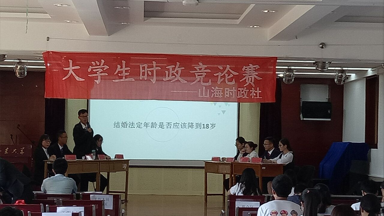 活动伊始,主持人向到场的评委和观众表示了欢迎,并介绍了评委、正反两方辩手以及比赛流程。之后,竞论赛就开始了,双方就“结婚法定年龄是否应该降到18岁”这一辩题展开激烈的竞论。本次竞论赛采用奇葩说模式,两组人轮流以演讲形式辩论。比赛开始的时候,双方辩手都略有紧张,但仍有条理地将各方立论娓娓道出。接着激烈精彩的两组就形成了对辩局面,一方抛出问题,环环相扣,企图使对方辩手落入圈套,对方辩手也不落下风,巧妙地避开锋芒,用数据和实例驳回问题,全场气氛达到高潮。最终经过评委的投票,主持人宣布反方代表队赢得胜利。辩论结束后,奇袭校队队长周美如同学主持了精彩的评委提问,做了一个好的收尾,活动就在热烈的讨论气氛中结束了。