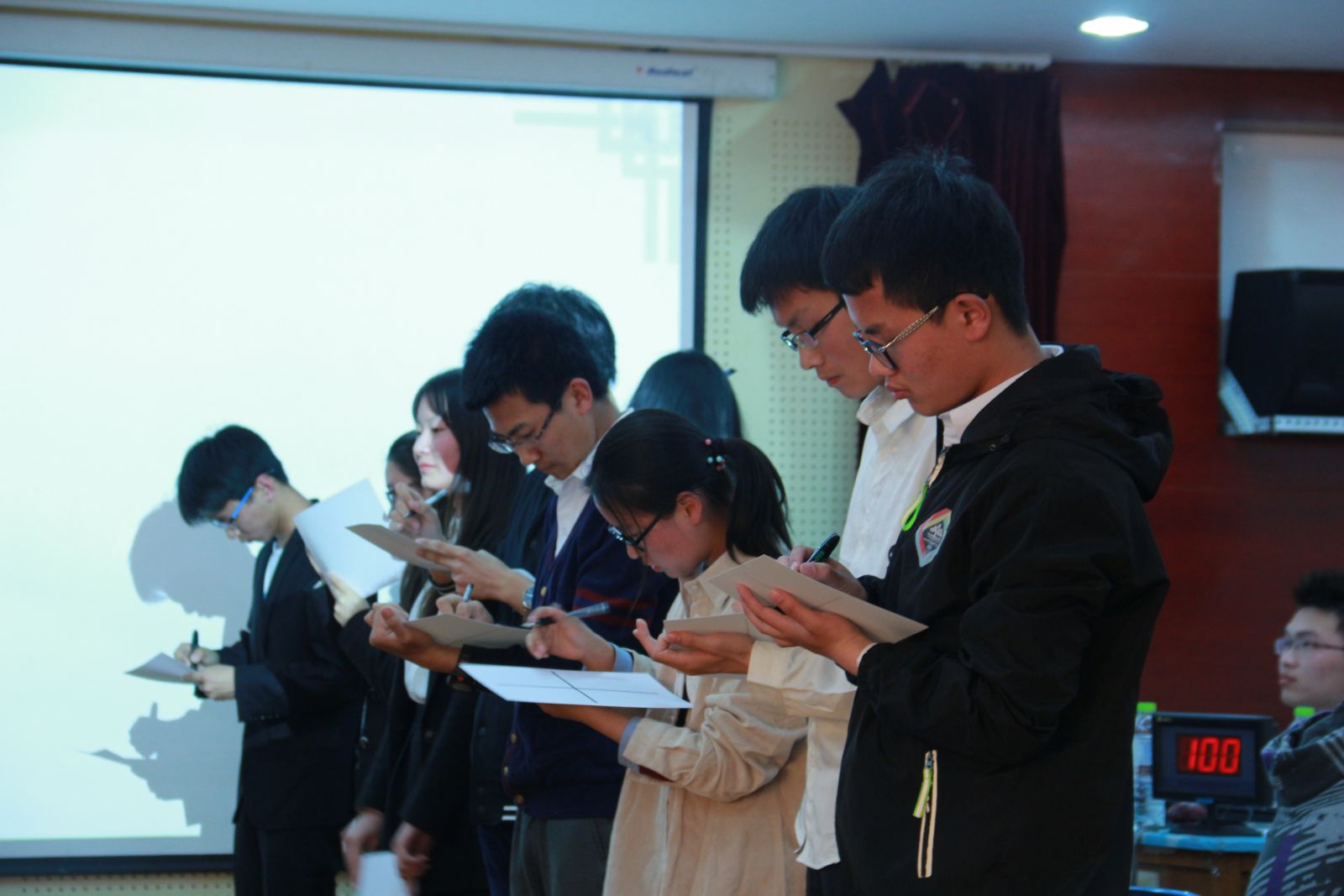 本次数学趣味知识竞赛分为初赛和决赛两个阶段。经历了4月15日的初赛后,8支代表队最终进入决赛。首先,主办方在大屏幕上放映出精心准备的视频,介绍了本次活动,使现场气氛热烈起来。随后,主持人介绍了本场辩论赛的评委和参赛队伍。之后进入第一环节,各支参赛队伍依次进行自我介绍,并表达了一起领略数学之美的美好祝愿。紧接着,主办方组织参赛队伍依次进行了谁是卧底,你画我猜,大师小传,攻其不备的比赛,比赛形式多种多样,内容精彩纷呈,趣味十足。在比赛过程中,选手们都凝神静思,在极短的时间内做出答案,台下掌声和惊叹声不断,大家都为选手们的智慧所折服。最终通过四个环节的比赛,哈工大代表队以390分的好成绩,获得一等奖,15统二和16数金代表队取得二等奖,15应数,15数金和16统一代表队获得三等奖,16应数和14应数获得优胜奖。随后,评委为在场各位选手颁发奖状 。至此,2017年第十一届数学趣味知识竞赛在一片掌声之中落下帷幕。