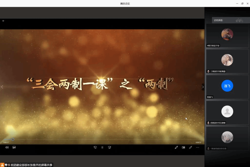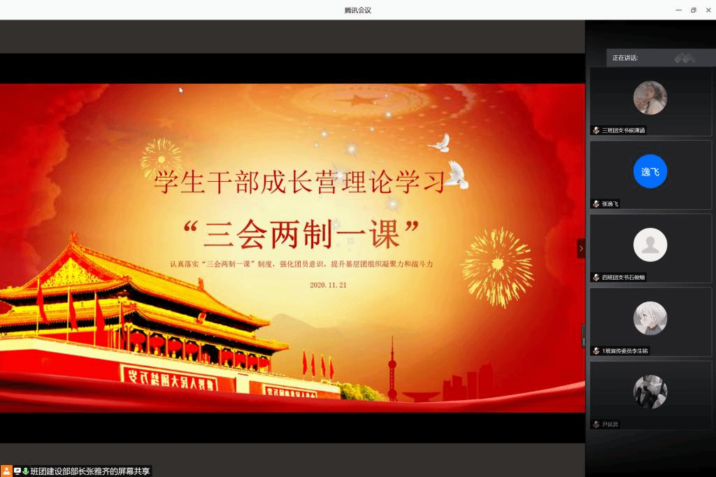 会议伊始,张雅齐向大家介绍了本次活动的流程及目的。本次活动围绕学习“三会两制一课”相关知识展开。全体参会人员共同学习了“三会”有关内容的视频。视频介绍了“三会”为团支部大会、支部委员会和团小组会,分别说明了“三会”各自的任务、目的、参与人员并举例展示了如何开展。共同学习后,张雅齐再次强调了团支部开展团支部大会方面的注意事项及团支部大会应当完成的各项任务,如入党积极分子推优入选,学习习近平总书记讲话等。她提出,“三会”的认真开展不仅是对团支部的工作负责,更是对支部内每一个同学负责,各团支部委员应时刻严谨认真。全体参会人员共同学习“两制”“一课”有关内容的视频。视频中以具体事例详细讲解了“两制”为团员教育评议制度和团员年度团籍注册制度,并且展示了优秀团课的开展方式。最后,张雅齐强调,所有团支部委员都要重视每一次团课,树立榜样意识,发挥带头作用。