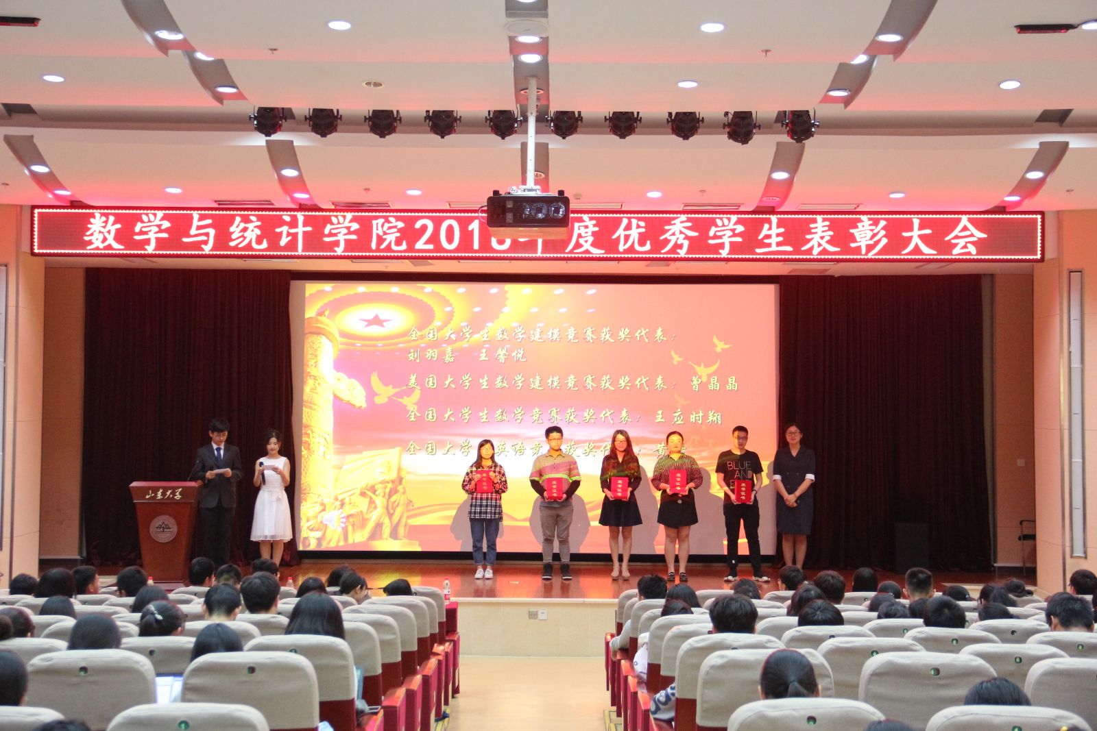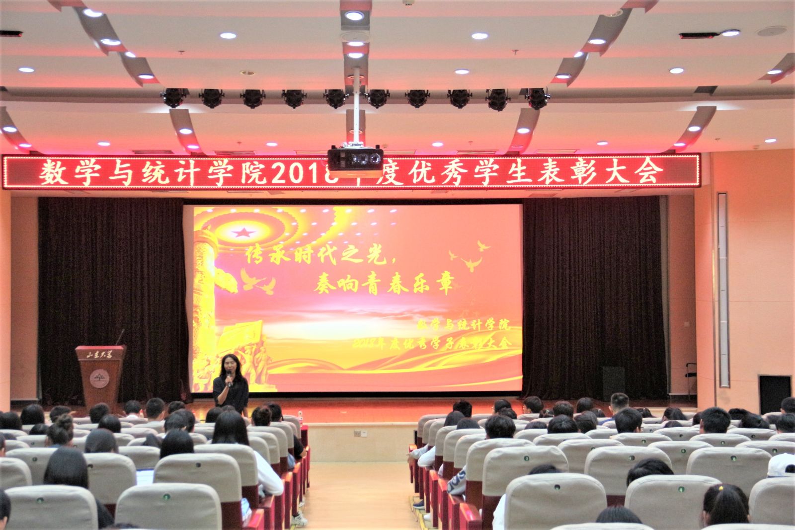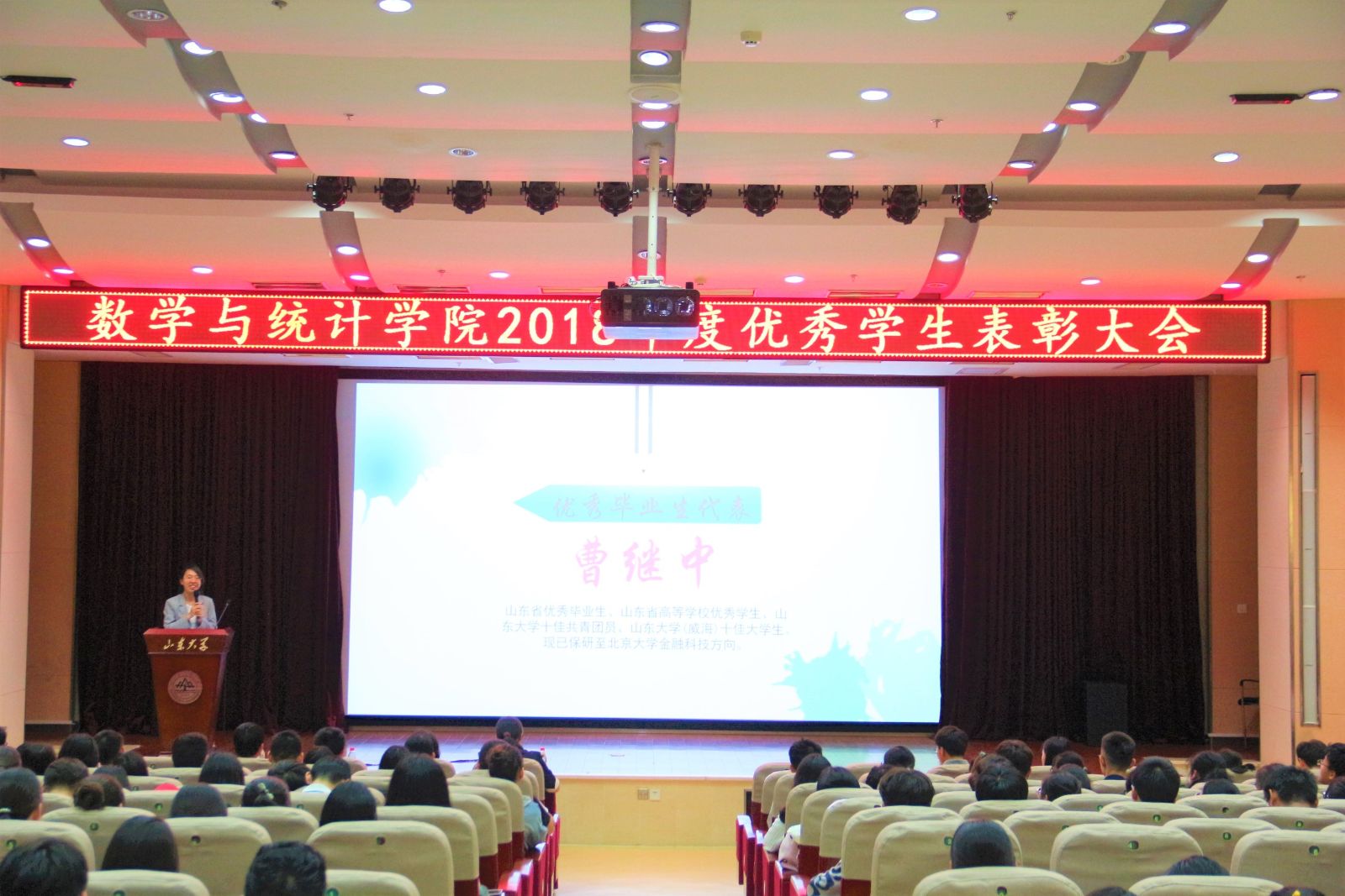 会议伊始,全体起立奏唱国歌。现场通过视频向与会老师及同学展示了十大网投官网学子过去一年里在科研、竞赛、实践、社会服务等方面取得的优异成绩。单丙波、王鹏飞、孙磊和赵德豪为优秀学生进行颁奖,表彰了2018年度在各个方面取得优异成绩的优秀学子。颁奖结束后,优秀学子代表进行经验分享。三年里获得三次国家奖学金、现已被保研至北京大学的曹继中,无论是学习、科研、实践还是学生工作都出类拔萃的张敏,互相激励、共同进步的22号楼409宿舍代表侯泽辰,每天都能坚持做一件小事的先锋代表赵炜逸,四位报告人向大家讲述了他们的经历,充分展示了他们从迷茫无措到确立方向,再到努力实现自己目标的过程,告诫同学们不要惧怕困难,要逐步提升自我。随后,六位同学朗诵了《与青春同行》,使同学们产生了很大的共鸣。最后,学院党委书记单丙波老师发表讲话。她对同学们的优异成绩表示充分肯定,并倡议大家积极发现并学习优秀的人的闪光点,坚持自己的闪光点,为自己定下目标并付诸行动。大家相互学习,互为榜样,共同成长!