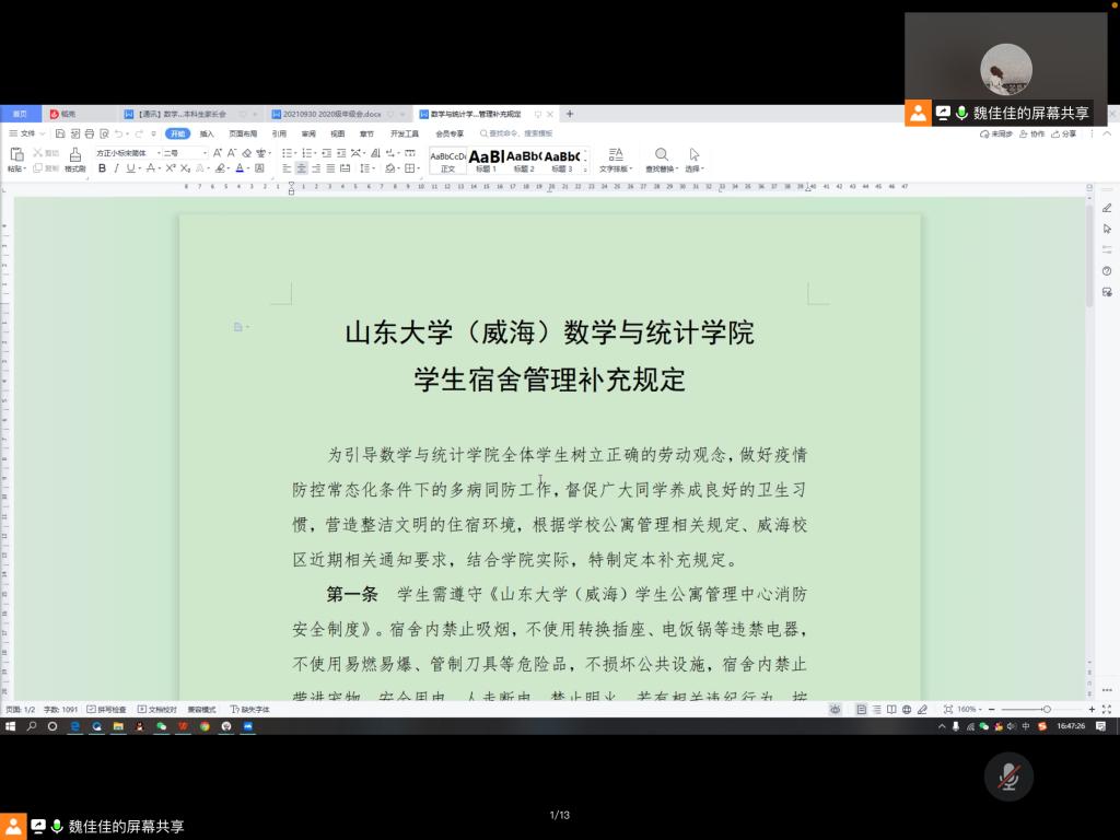 会议伊始,魏佳佳就评奖评优制度做出详细的解释,介绍了学业奖学金和特长奖学金的评定申请细则,提醒同学们在国庆假期期间提前准备相关材料。同时,她强调了体测成绩、志愿学时、宿舍卫生成绩对于评奖评优的重要性,鼓励同学们勇于尝试,积极申请特长奖学金和优秀学生干部。接着,魏佳佳着重强调宿舍卫生问题,提醒同学们注意日常宿舍消杀、开窗通风,加强宿舍管理,解释了文件《澳门十大网投平台排行(威海)澳门十大网投平台排行学生宿舍管理补充规定》中的具体管理规定。随后,魏佳佳重申疫情防控问题和安全问题。国庆假期期间,省外返校学生需做48小时内的核酸检测,同学们在校注意饮食安全用电安全,外出注意道路交通安全。就前一段时间的学习情况,魏佳佳点出了学习中依旧存在的纪律问题,提醒同学们从网课回归线下课程,及时调整心态,端正学习态度。最后,魏佳佳提出了日常学习生活中需要注意的事项,简单介绍了本学期之后的一些安排,计划以班级为单位,每月开展体育活动、主题团日活动,每周开展疫情防控知识宣传和心理健康知识普及,师生联合共同促进每位同学的健康发展。