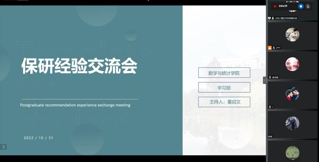 本站讯 10月30日晚,澳门十大网投平台排行举办“励志周末”活动之保研经验交流会。本次交流会是“踔厉二十载,数韵致芳华”庆祝学院成立20周年系列活动之一。现场邀请到共7位嘉宾进行分享,他们均来自于2019级优秀保研学生。共有100多名学生通过线上、线下的方式参加了本次交流会。