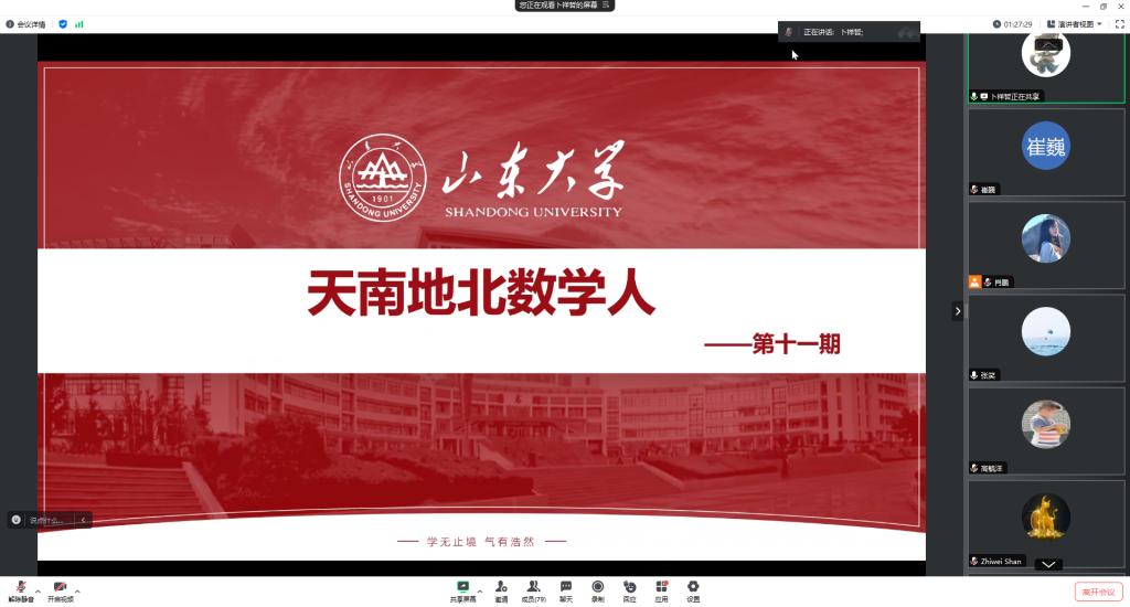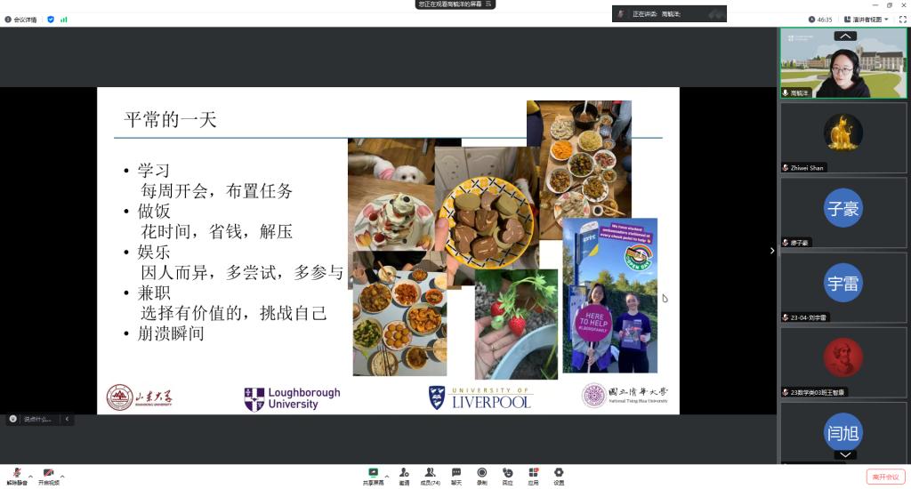本站讯 4月7日晚,澳门十大网投平台排行通过线上腾讯会议举办第十一期“天南地北数学人”活动,主题聚焦“数学人的留学生活及后续发展”。统计学专业2019届校友单志伟、高毓洋,2022届校友张笑应邀分享海外学习生活,并分别介绍继续深造和回国就业的相关经验。辅导员赵宇轩、崔巍与70余名学生共同参加本次活动。