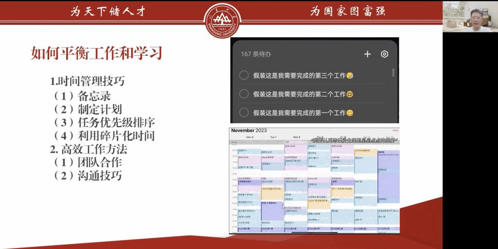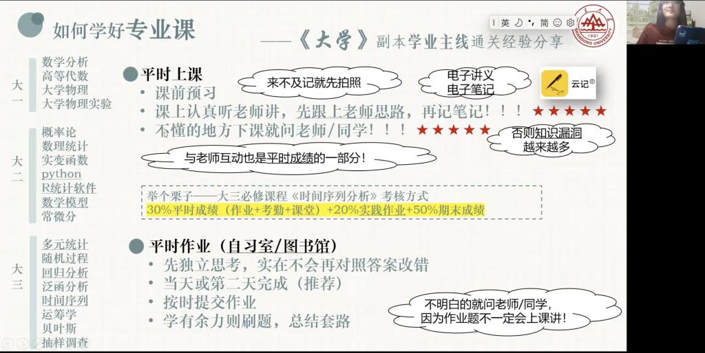 分享会上,张维佳围绕大学校园生活进行了分享,他深入浅出地讲述了积极参与校园活动的意义,并就如何根据自身需求和特点,有重点地参与校园活动进行了经验交流;潘亚君重点分享了学习经验和方法,她就如何学好专业课、思政课、选修课、英语课等进行详细讲解,并向新生分享了众多实用学习工具;刘宇昊介绍了数据科学与人工智能实验班的培养目标,并以2023级为例,全面讲解了选拔要求和方法、上课方式、作业要求等相关问题;王震豪从科研创新方面进行了分享,他详细介绍了学校、学院科研创新平台,并就科研的重要性、如何参与科研、如何开展科研等给出了自己的见解;宋绪涛分享了学生工作经验,全面介绍了学院学团组织情况,并结合自身经历,阐释了如何平衡社会工作与学业的关系,鼓励大家积极参加社会工作,在服务同学中提升自身能力。在互动环节当中,新生们就学习、生活、实验班等多个方面积极提问,主讲人分别结合自己经验逐一作出了详实解答,现场气氛十分活跃。