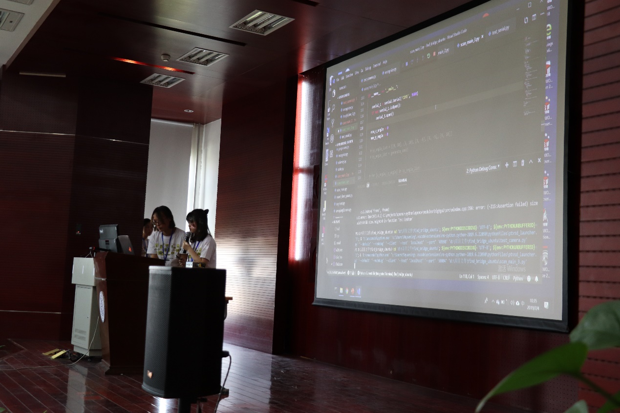 展示伊始,黄河源带领队伍向评委和观众们问好,队伍成员相继进行了自我介绍。随后,黄河源开始介绍项目背景和特点对比综述,并和马悦宁一同演示了扫描仪硬件的工作流程,黄河源负责解说,马悦宁负责硬件操控。马悦宁将扫描仪摄像头打开后,现场观众均挥手与摄像头互动,画面同步展示于大屏幕上,现场效果极佳。其后,曹晓蕊介绍了硬件结构,马悦宁讲解了算法原理。最终,由李天然进行了项目总结和拓展应用。展示结束,由马悦宁带领队伍顺利进行了七分钟的英文答辩。
