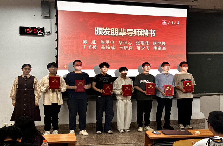 学院学生科学技术协会代表苗丹对本届“青苗计划”的培养模式、课程安排和考核标准等内容进行了详细解读,帮助学员明确学习方向。上一届优秀学员代表贾绍聪结合自身实际科研经历,向学员们分享了自己参与“青苗计划”科创训练营的心得体会与成长感悟。随后,崔巍为入选本届训练营的朋辈导师颁发聘书,肯定了他们在朋辈科创启蒙中的骨干作用。