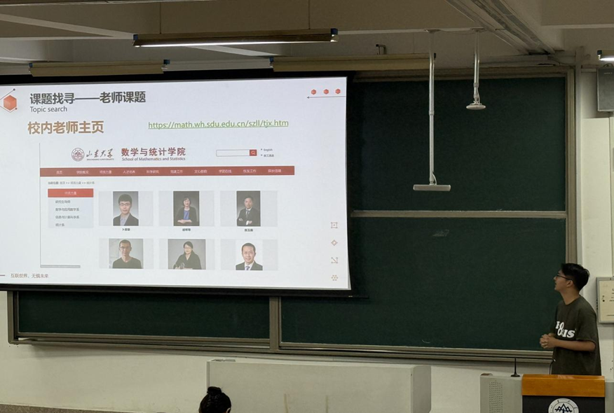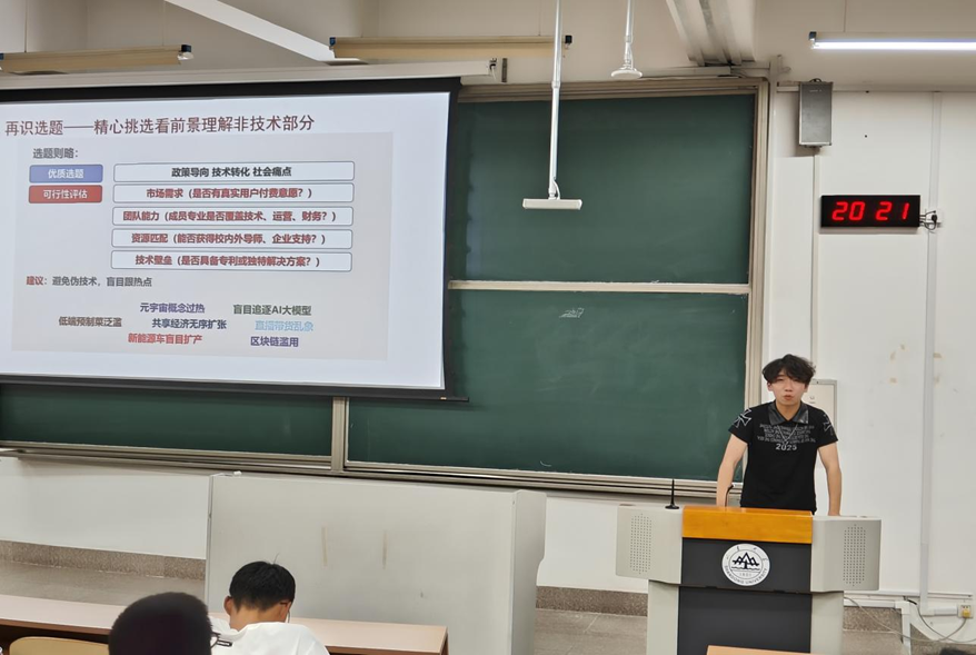 在讲座分享环节,朋辈导师丁子杨结合自身的学术科研经历,以“如何找到第一个研究课题”为主题,从课题找寻、可行性分析到科研工具方面进行了讲解,为同学们提供了实用参考。朋辈导师王培霖则聚焦创赛,回顾了自身课题研究的过程,从初识选题、再识选题和提升方向等方面进行了分享,例子生动形象,内容深入浅出,获得现场观众的阵阵掌声。