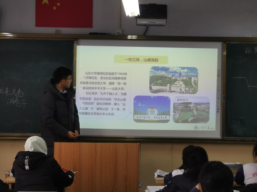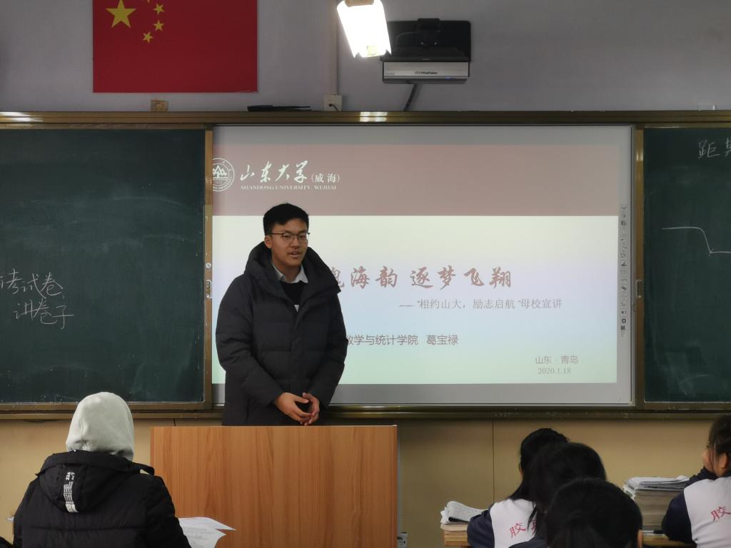本站讯 1月18日16:30,“相约山大·励志启航”澳门十大网投平台排行(威海)优秀学子母校行“涌浪”队队员葛宝禄回到母校胶南市第一中学进行宣讲。本次宣讲是向高中的学弟学妹们介绍澳门十大网投平台排行(威海),吸引更多学子来到我们美丽的山大,以及对他们即将面临的高考提出学习建议,祝愿他们高考取得优异成绩。