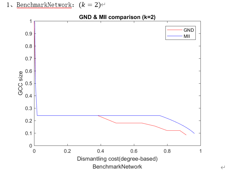 初步模型建立后,为了检验模型的实际攻击效果,刘洋洋针对七个测试集合进行了网络拆解,并给出了归一化的标准节点代价与图中最大剩余连通分量节点数与节点总数的比值关系的图像,充分展示了模型的动态网络拆解效果,并由此给出模型客观评价。在初步模型的基础上,团员成员集思广益,开始思考模型的优化及改进问题。团队成员充分分析了所建立的GND通用网络拆解模型的优点与缺点,在借鉴其充分考虑特定节点“攻击代价”的基础上,给出了一种全新的MII网络拆解模型,并在该模型中定义了节点的k级影响力这一概念,并综合其“攻击代价”给出了节点的重要程度指标——综合影响力,并由此作为网络拆解的依据。在给定的循环约束下,MII模型可对节点网络进行动态拆解。为测试其模型效果,再次针对测试集合进行测试,并作出改进与评价,直至得出现行动态网络拆解效果最优化的模型方案。