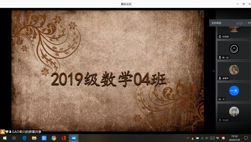 本站讯 2020年7月8日晚上8点,2019级数学类4班于腾讯会议召开以“启航”为主题的最后一次班会,全体同学按时参加。本次会议由班长高锋主持,辅导员王祎璠、班主任高铭威和科研班主任陈琰钰出席,旨在让同学们告别过去,以全新的精神面貌开始新的学期。