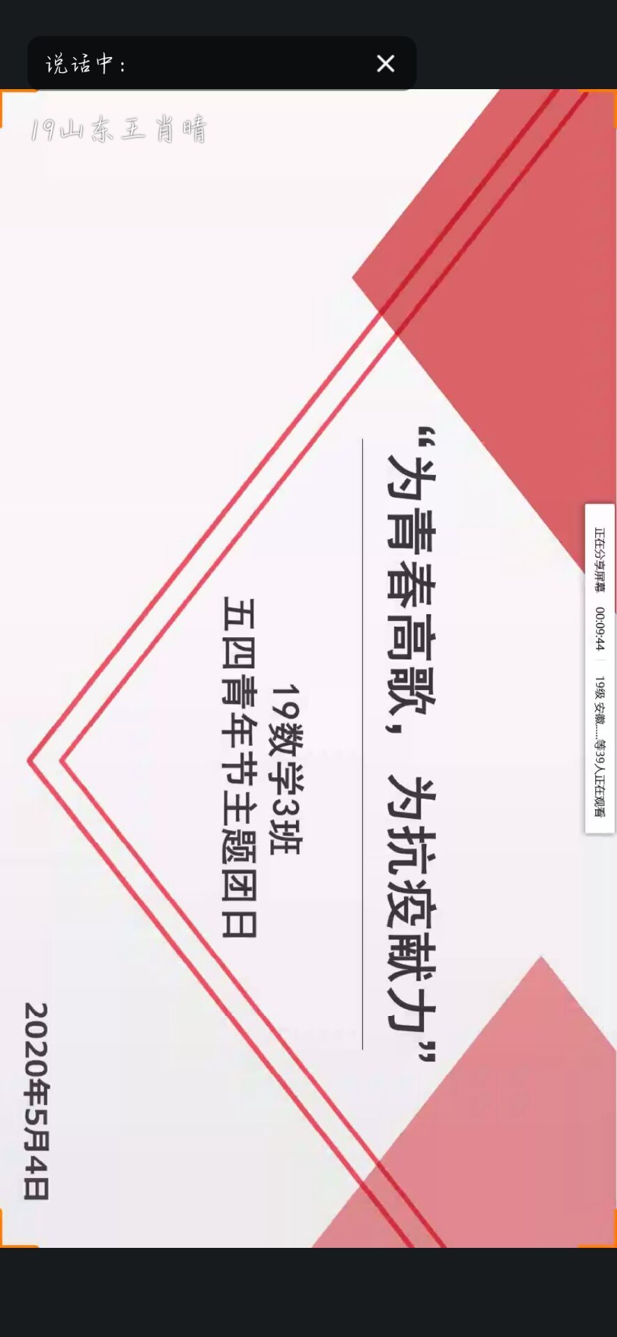 本站讯 5月4日晚8:30至9:30,2019级数学3班团支部举办“为青春高歌,为抗疫献力”主题团日活动,本次主题团日活动以线上班会的形式开展,由团支部委员共同策划,团支书王肖晴主持。