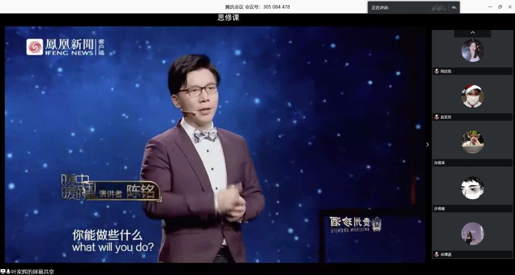 本次心理班会共分为线上和线下两个部分。活动伊始,叶家辉首先借由一段《暖暖的中国》中陈铭的演讲带大家一起回顾在全民阻击疫情期间,每一个平凡人带给我们的感动。视频结束后,他与同学们分享了自己的想法。他鼓励大家积极面对无可避免的困难与挑战,感恩生活教会我们坚强与勇敢。紧接着,他就同学们近期可能面对的一些心理上的困扰做出一一解答,缓解了同学们的些许担忧。同时为了不让同学们活成一座座孤岛,本学期心理班会特别设置了线下的活动。叶家辉倡导同学们以宿舍为单位,组织一次语音通话或者视频通话,和许久没有见过的好朋友聊聊天。随着疫情逐步得到控制,大部分同学的家乡正在重启,逐渐恢复以前的样子。他也鼓励同学们在做好个人防护的前提下,多出去走一走,用镜头记录下车水马龙、商场街道、满园春色等。