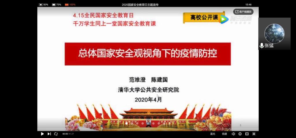 本站讯 2020年4月15日星期三下午4:00,澳门十大网投平台排行2019级数学02班开展安全教育主题班会,班会由班长张猛主持带领同学们集体观看了由清华大学公共安全研究院公共安全领域专家、中国工程院院士范维澄主讲的“4·15全民国家安全教育日——千万学生同上一堂国家安全教育课”。