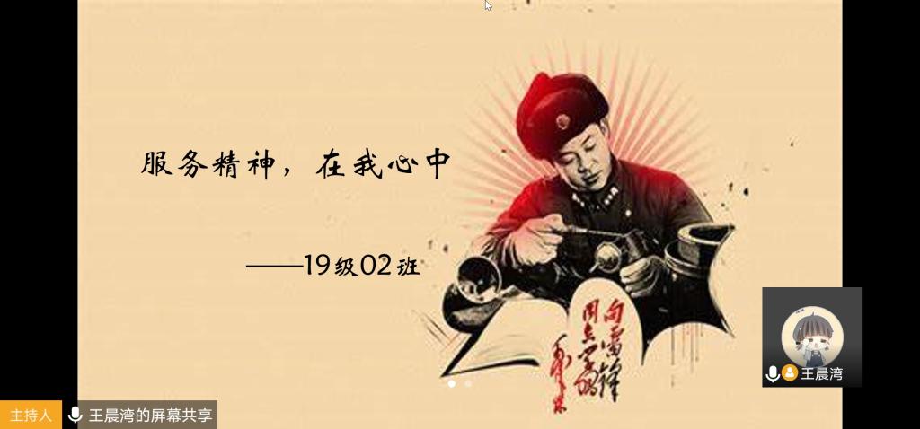 本站讯 2020年3月13日下午两点,澳门十大网投平台排行2019级02班在就业委员王晨湾的带领下,积极开展了线上“观雷锋视频,学雷锋精神”学雷锋月志愿活动。活动由就业委员王晨湾举办并主持,2班全体同学参加。