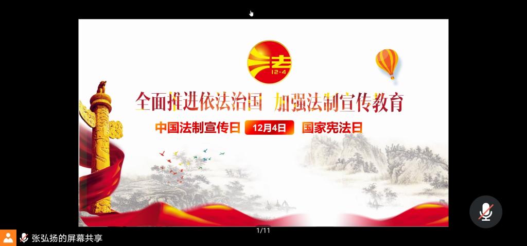 本站讯 2020年12月8日下午17:00,澳门十大网投平台排行2019级数学与应用数学班于线上开展了12月主题团日活动,此次活动主题为“全面推进依法治国,加强法制宣传教育——中国宪法日暨法制宣传日活动”。团支书张弘扬主持此次会议,数学与应用数学班全体团员参加。