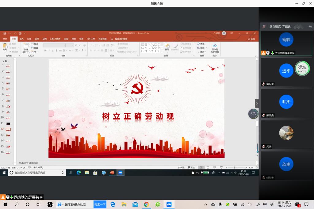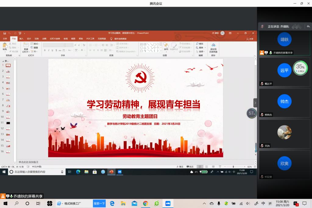 本站讯 3月20日下午15:00,澳门十大网投平台排行2019级统计学二班开展“学习劳动精神,展现青年担当”主题团日活动,本次主题团日活动以线上会议的形式进行。本次会议由团支书乔靖轶主持,2019级统计二班全体同学参加。