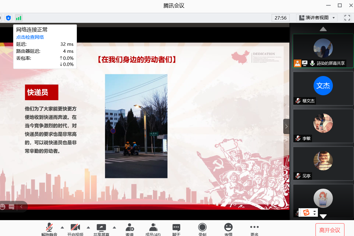 本站讯 2021年3月19日下午,2019级统计一班通过腾讯会议举行“弘扬新时代劳动精神”雷锋月主题团日活动。该会议由团支书张雅齐主持,班级全体同学参加。