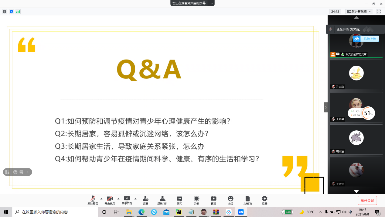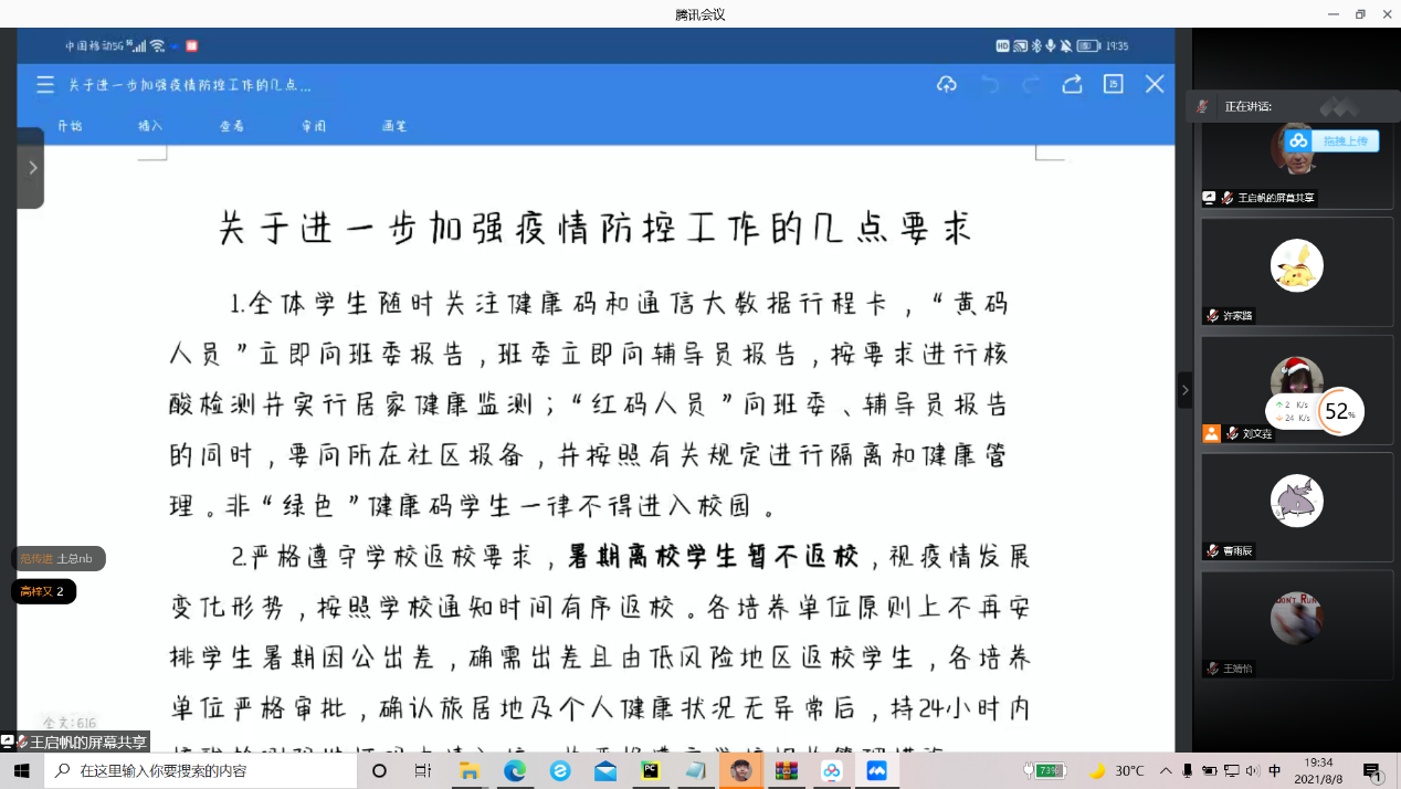 本站讯 为响应国家疫情防控政策,落实疫情防控工作,提高同学们暑假期间疫情防控意识,8月8日晚,澳门十大网投平台排行2020级数据科学与人工智能实验班召开了疫情防控暨心理健康安全线上班会。本次班会由生活委员王启帆、心理委员刘文垚主持,2020级数据科学与人工智能实验班全体同学参与。