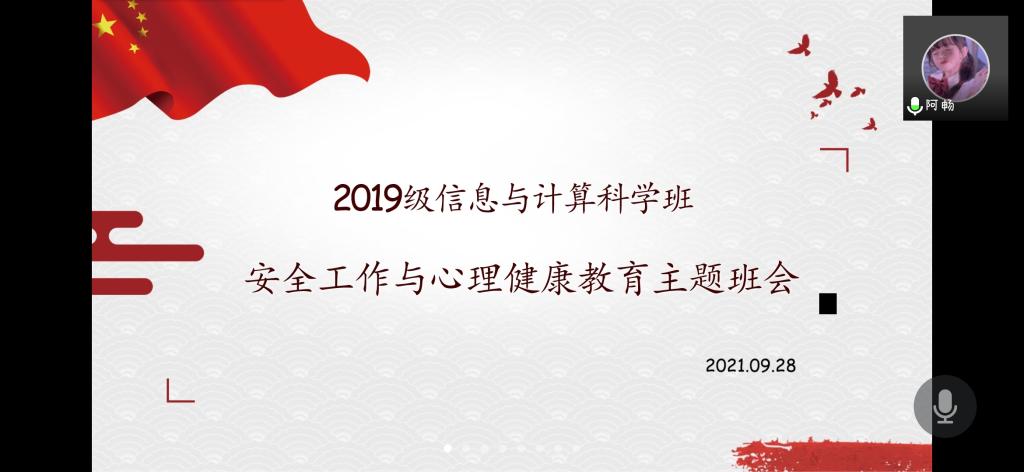 本站讯 2021年9月28日下午四点半,澳门十大网投平台排行2019级信息与计算科学班于腾讯会议举办“安全工作与心理健康教育”主题班会。本次班会由2019级辅导员王祎璠主持,共58人参加。