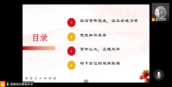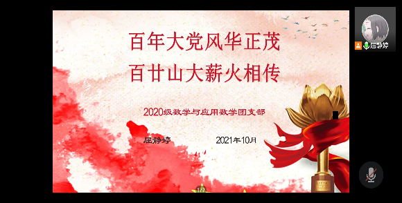 本站讯 10月22日下午,澳门十大网投平台排行2020级数学班开展“百年大党风华正茂,百廿山大薪火相传”线上主题团日活动。本次活动由2020级数学班团支书屈静婷主持,2020级数学班全体团员参与。