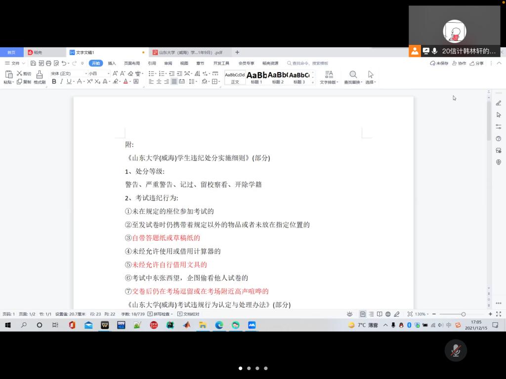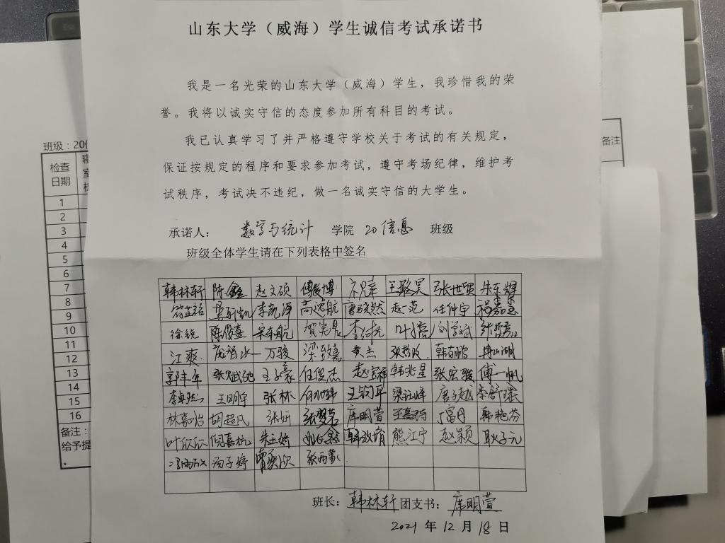 首先,韩林轩向同学们说明了诚信考试的重要性。诚信考试是为了通过考试培养学生的诚信品质,让学生排除外界干扰,正确认识考试对评价自己的重要性。韩林轩带领同学们学习了《普通高等学校学生管理规定》《澳门十大网投平台排行(威海)学生违纪处分实施细则》文件中关于考试违纪行为的相关规定,阐述了考试作弊的危害,指出考试作弊的相关处分,以及处分对今后学习与发展的影响,告诫大家不要出现考试违规行为,重视诚信,提醒同学们认真备考。班会结束后,韩林轩组织同学们签署了诚信考试承诺书,要求同学们端正考试态度,诚信考试,确保考试的公平性,共同建设澳门十大网投平台排行和信息与计算科学班的良好学风。