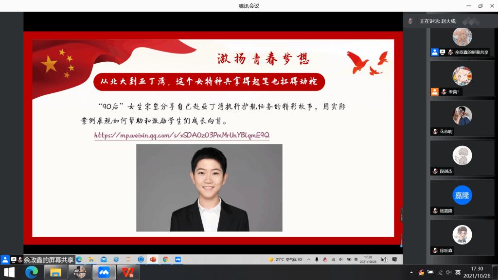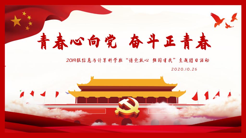 本站讯 2021年10月26日下午16:30,澳门十大网投平台排行2019级信息与计算科学班于腾讯会议举办“青春心向党 奋斗正青春——请党放心 强国有我”主题团日活动。本次活动由信息与计算科学班团支书王肖晴发起,团支部委员共同筹备组织,由团支书王肖晴、班长赵大成和组织委员赵新宇共同主持,团支部共53人参加,辅导员王祎璠列席参加。
