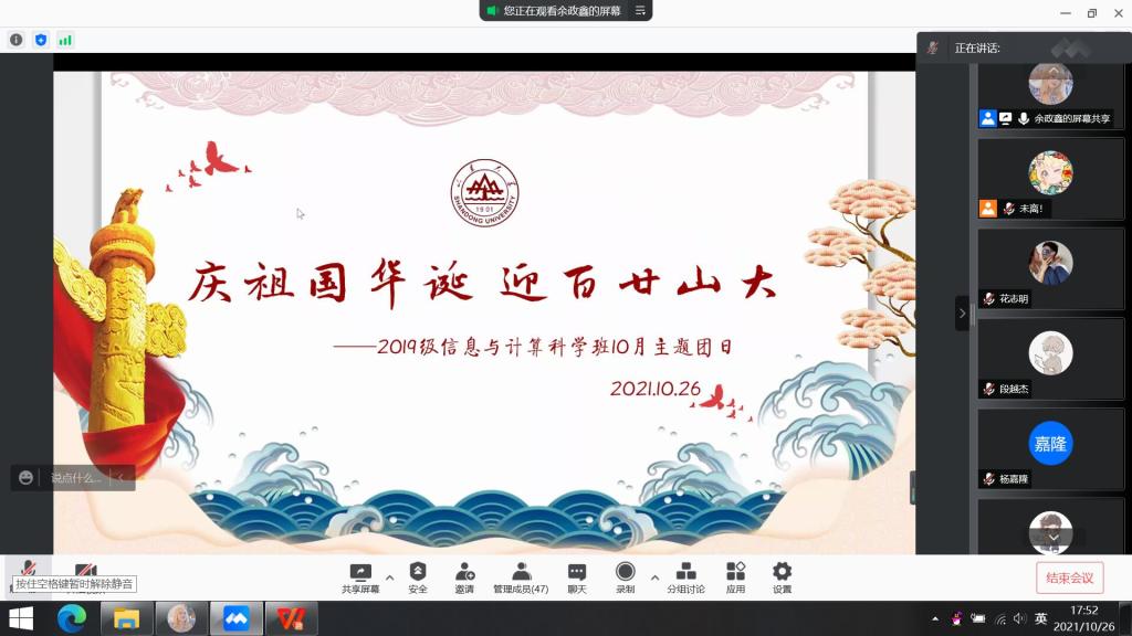 本站讯 2021年10月26日下午18:40,澳门十大网投平台排行2019级信息与计算科学班于腾讯会议举办“庆祖国华诞 迎百廿山大”10月主题团日活动。本次活动由信息与计算科学班团支书王肖晴发起,宣传委员余政鑫和文体委员何雨霖共同筹备组织,宣传委员余政鑫主持,团支部共53人参加。