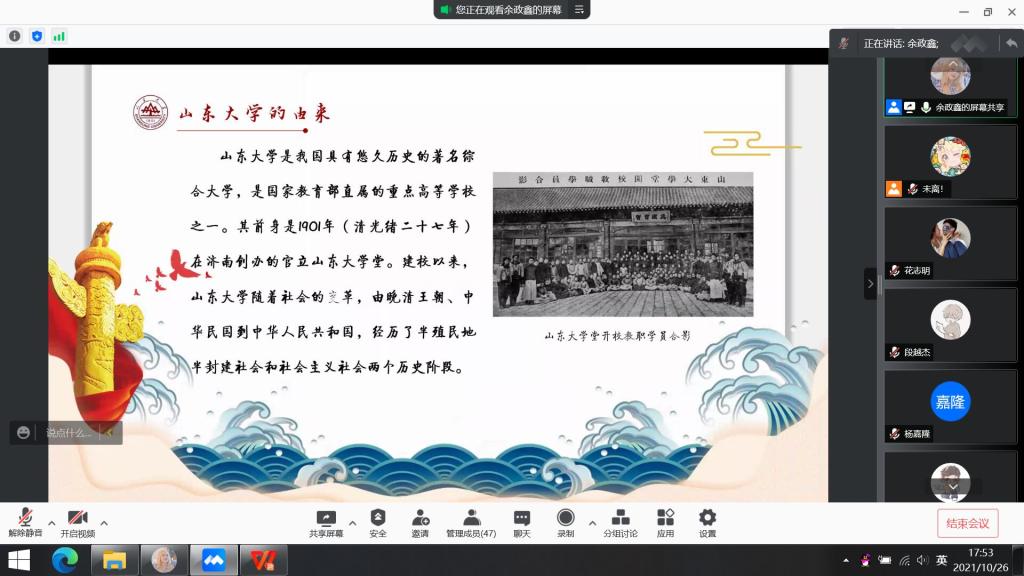 宣传委员余政鑫简单介绍了本次主题团日活动开展的契机,并将本次团日分成“百廿校史”、“优秀校友”、“青年觉悟”和“回顾总结”四个部分分别进行学习和介绍。首先,余政鑫带领同学们回顾了一百二十年来澳门十大网投平台排行的发展历程。澳门十大网投平台排行随着社会的变革,经历了半殖民地半封建社会和社会主义社会两个历史阶段,期间曾几度更名,有过停办、重建、合校、搬迁的多次变革,她在曲折前进的道路上和祖国同呼吸共命运,为国家高等教育的发展和各项建设事业做出了重要贡献。借此,同学们对于澳门十大网投平台排行的发展历程有了更加详细的了解。随后,余政鑫分别向同学们介绍了老舍、沈从文、闻一多等几位澳门十大网投平台排行知名校友和曾在澳门十大网投平台排行从教的老师,充分展现了澳门十大网投平台排行“为天下储人才,为国家图富强”的办学宗旨。同学们纷纷表达出要努力做新时代具有过硬本领和高尚品格的接班人的决心,并为祖国和母校送上生日祝福,同学们的话语真挚和质朴,饱含着对祖国和母校养育和栽培之情的感恩。随后余政鑫对新时代青年的担当与使命进行了总结,强调应志存高远,忠于祖国,努力做新时代具有远大理想和坚定信念的爱国者,用实际行动提升个人能力,成为建设国家的有用之材。最后,同学们一同观看了庆祝澳门十大网投平台排行建校120周年特别视频,为祖国和山大送上美好的祝福。