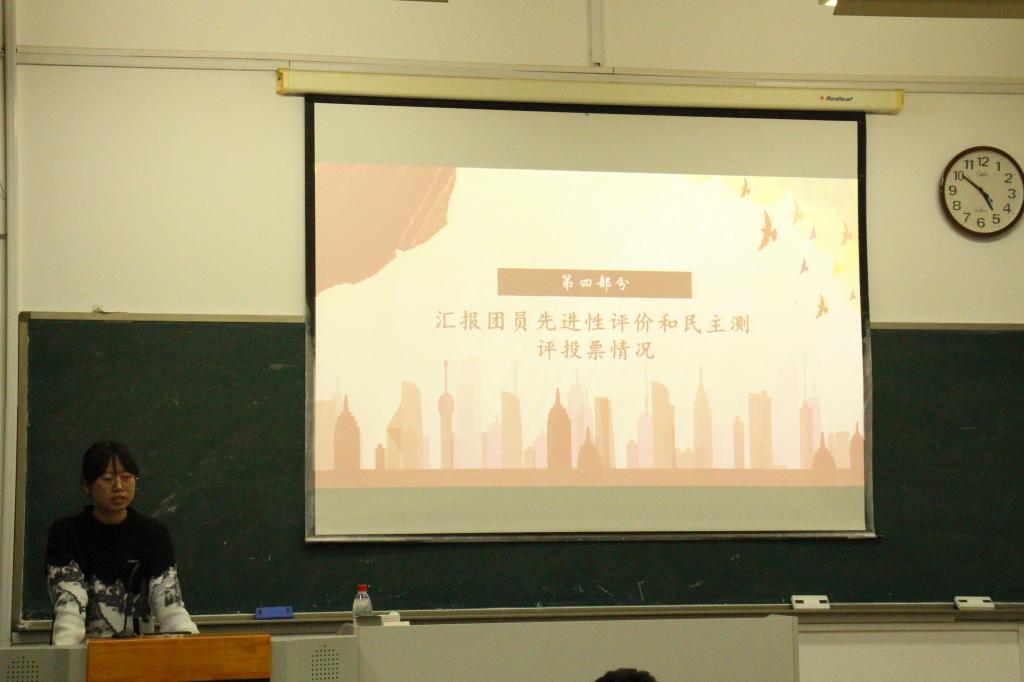 会议伊始,王肖晴简短的介绍了开展本次会议的目的以及会议的主要流程,并带领团支部全体同学唱团歌。随后王肖晴从党史学习完成率、学习速度等方面汇报了团支部今年的党史学习情况,并针对党史学习的完成效率提出建议。接下来,五个团小组分享了每组关于党的十九届六中全会精神、习近平总书记在纪念五四运动100周年大会上的讲话精神以及习近平总书记在庆祝中国共产党成立100周年大会上的重要讲话精神的学习感悟,提出了很多独到的见解,并对小组情况从政治、学习、工作、思想、作风等方面进行了简要说明。在汇报团员先进性评价和民主测评投票情况环节中,王肖晴就上次民主评议的结果向团支部全体同学进行公示。王肖晴对团支部最近的组织纪律情况、学习情况以及本次会议的开展情况进行了总结,指出了目前团支部存在的不足之处,并提出了相关的改善建议与举措。最后,会议在全体团员重温入团誓词的朗诵声中落下帷幕。