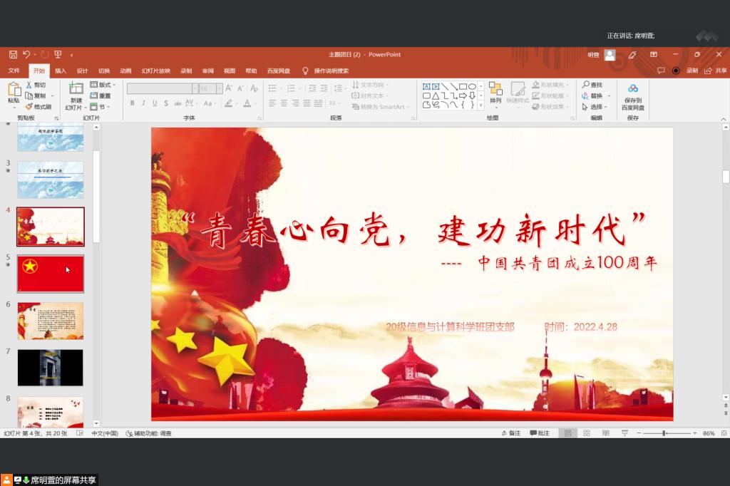 本站讯 4月28日晚,澳门十大网投平台排行2020级信息与计算科学班开展“青春心向党,建功新征程”主题团日活动。活动由团支书席明萱主讲,2020级信息与计算科学班全班同学共同参与。