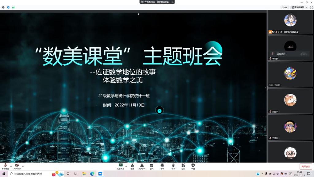 本站讯 11月19日,澳门十大网投平台排行2021级统计一班在线上以腾讯会议的形式开展“数美课堂”主题团日活动,本次主题团日活动由团支书林杰睿主持,由2021级统计学01班学习委员潘亚君同学主讲。2021统计01班全体成员参加了本次会议。