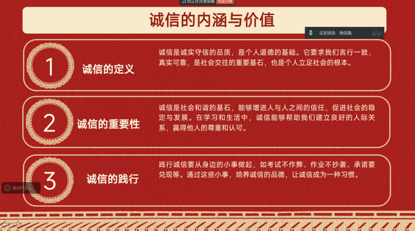 班会上,诚信教育成为重要议题。通过剖析校园贷等真实案例,同学们深刻认识到诚信不仅是个人立身之本,更是社会和谐的基石。主持人强调:“无论未来走向何方,都要以诚信为本,珍视信用记录,在科研、职场与社会交往中践行契约精神。”毕业生们纷纷表示,将牢记师长嘱托,在人生新阶段坚守道德底线,以扎实学识和正直品格回馈社会。